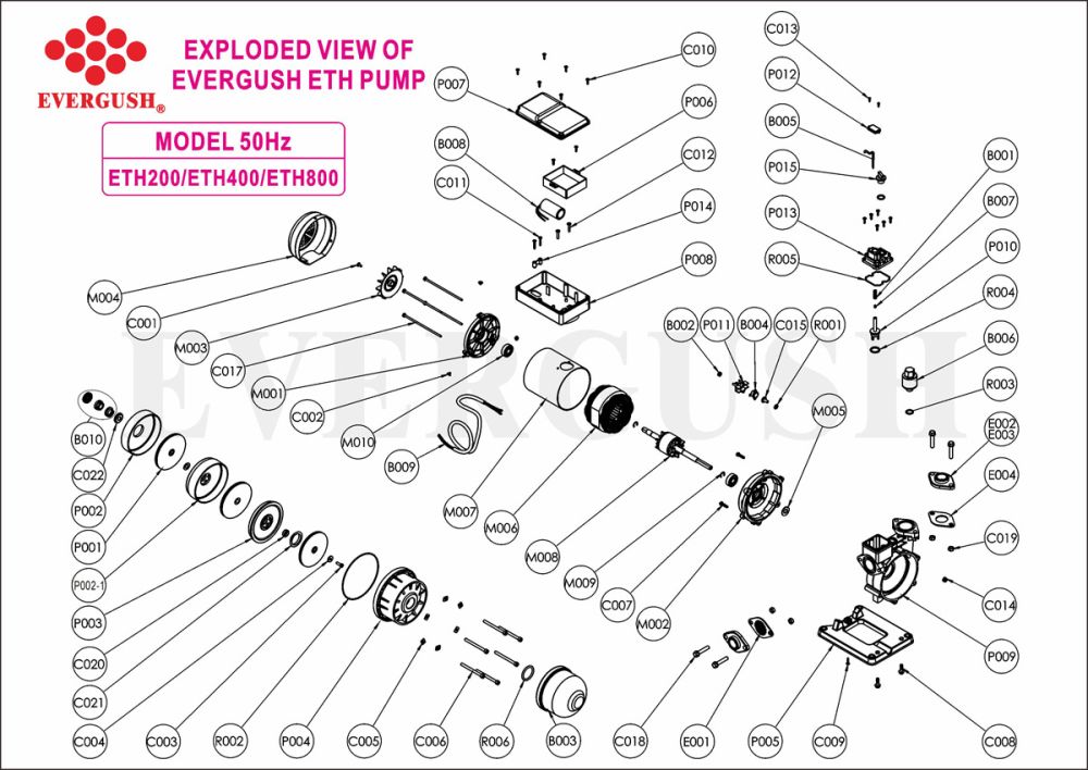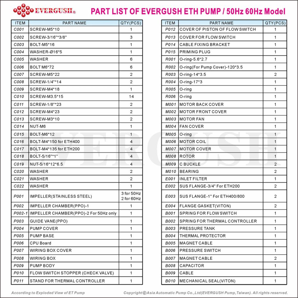 - Standard Performance for 50Hz Model: ETH200:15M*30LPM ; ETH400: 20M*36LPM ; ETH800: 24M*52LPM