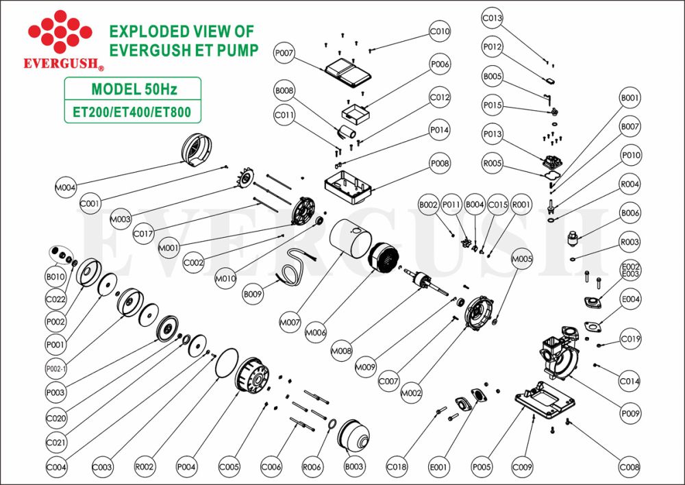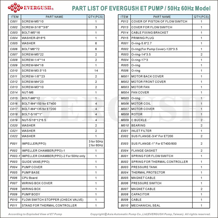 - Standard Performance for 50Hz Model: ET200:15M*36LPM ; ET400: 20M*40LPM ; ET800: 25M*45LPM