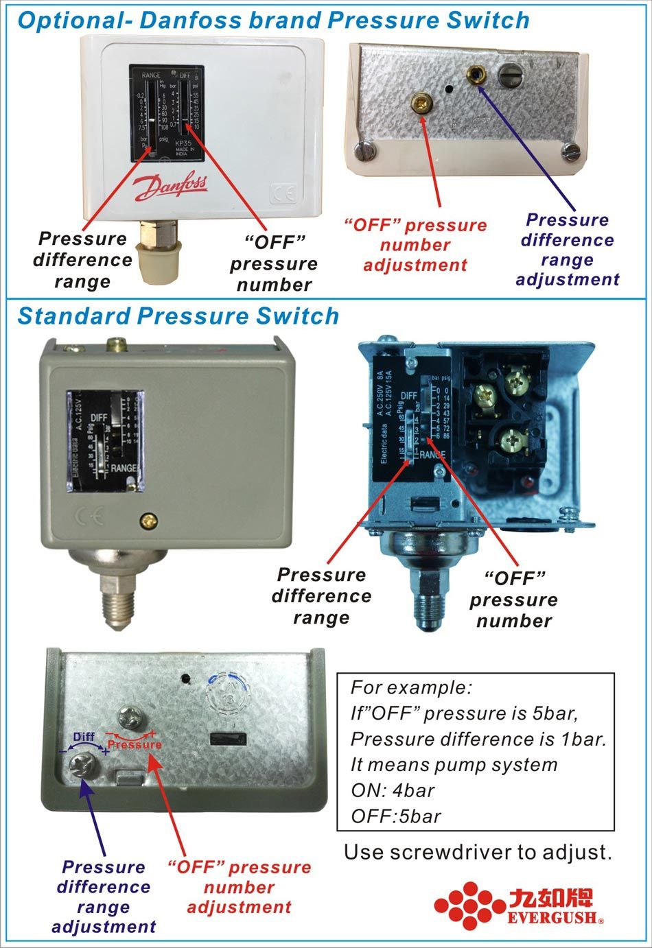 - The PC pump system is controlled by pressure switch.Pressure range and difference is adjustable upon request.