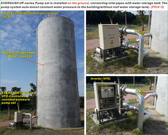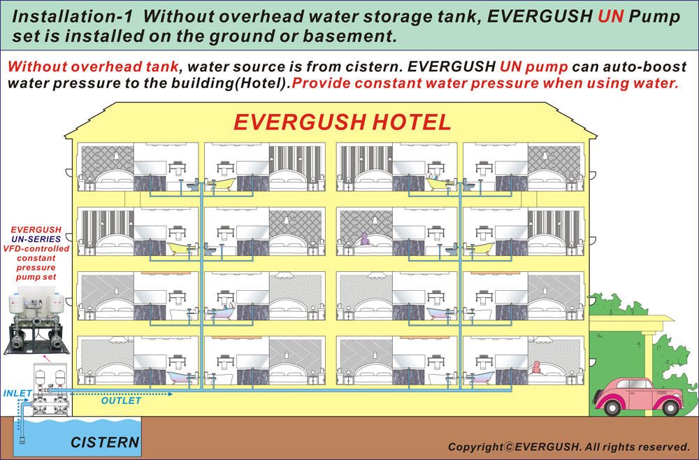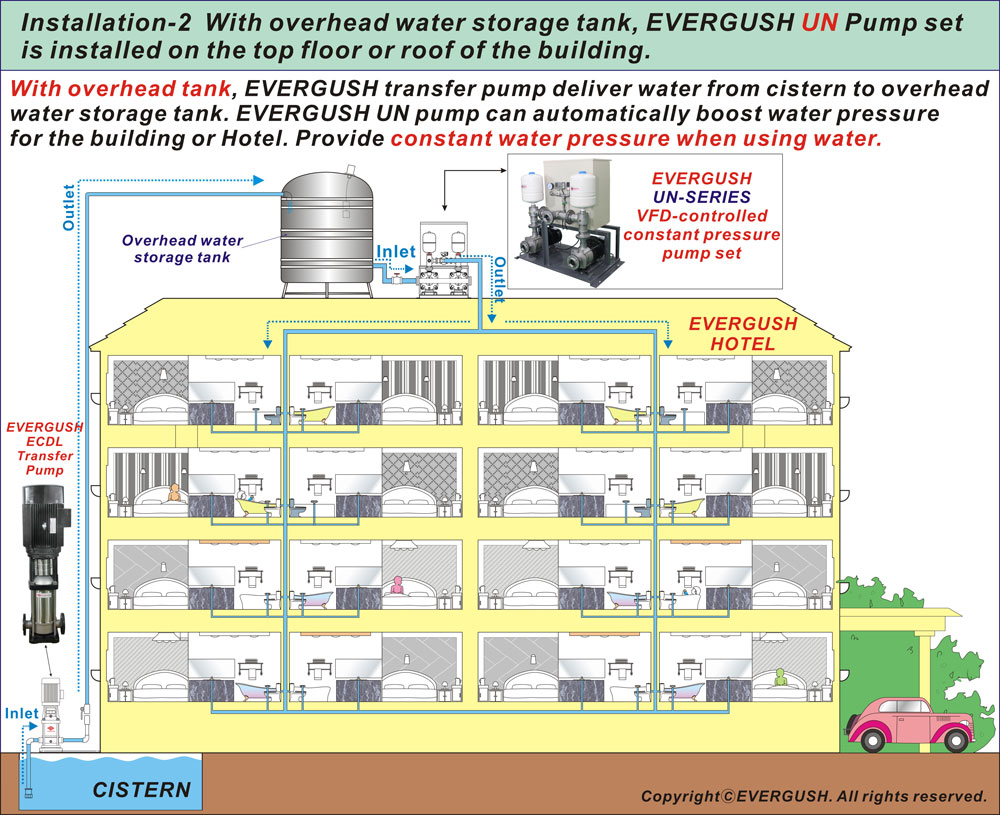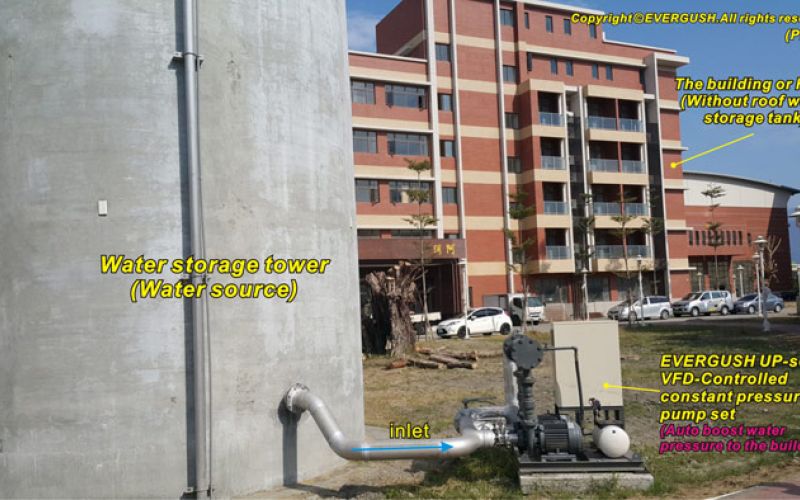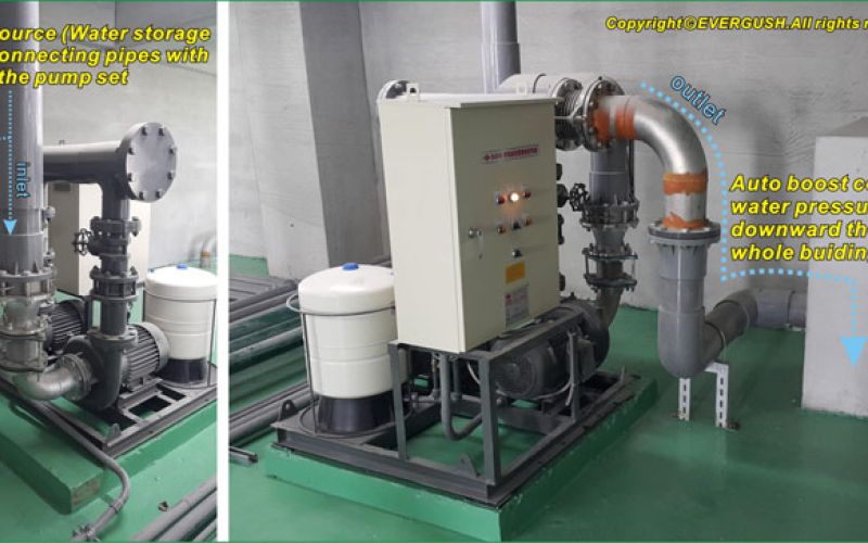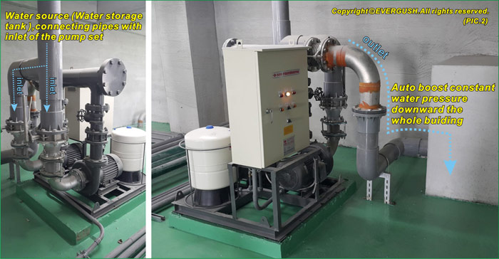 - Major installation ways- One is installed the pump system in the top floor or roof of the building, auto-boost water pressure downward whole building. Another is installed the pump system on the ground or basement, auto-boost water pressure to (upward) the building.(Please refer to below Installation 1~2)